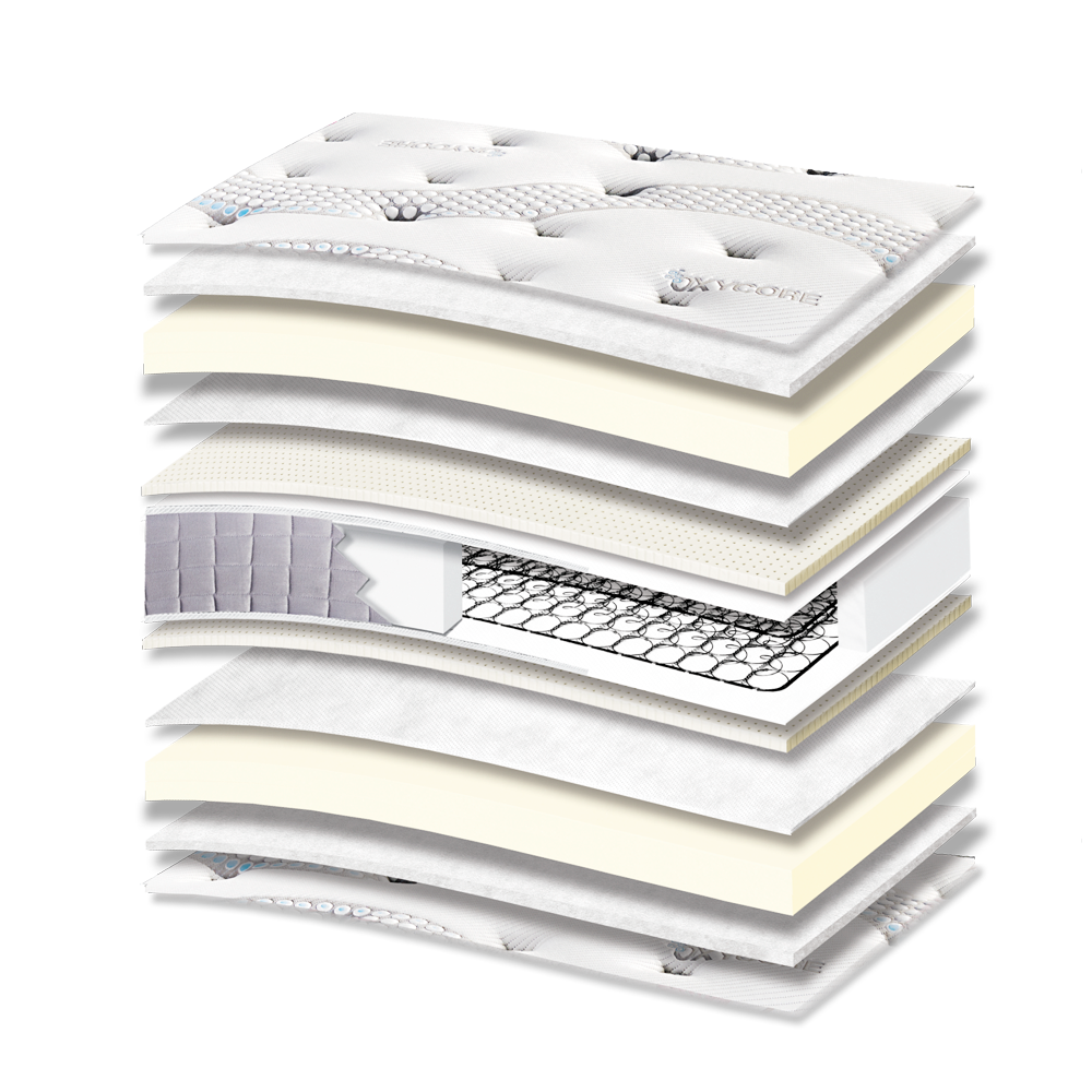 353 Smart Oxycore Memory Latex orthopedic mattress with luxurious Ocean fabric, which with friction exudes an aroma of freshness and renewal for a unique feeling of relaxation and well-being. Extremely soft mattress made of high-quality foam materials with memory foam technology that absorbs the weight of the body, reducing pressure on the joints. The interior of the mattress combines Bonnell springs with a latex mat that adapts to every movement while allowing the natural passage of air.Materials
