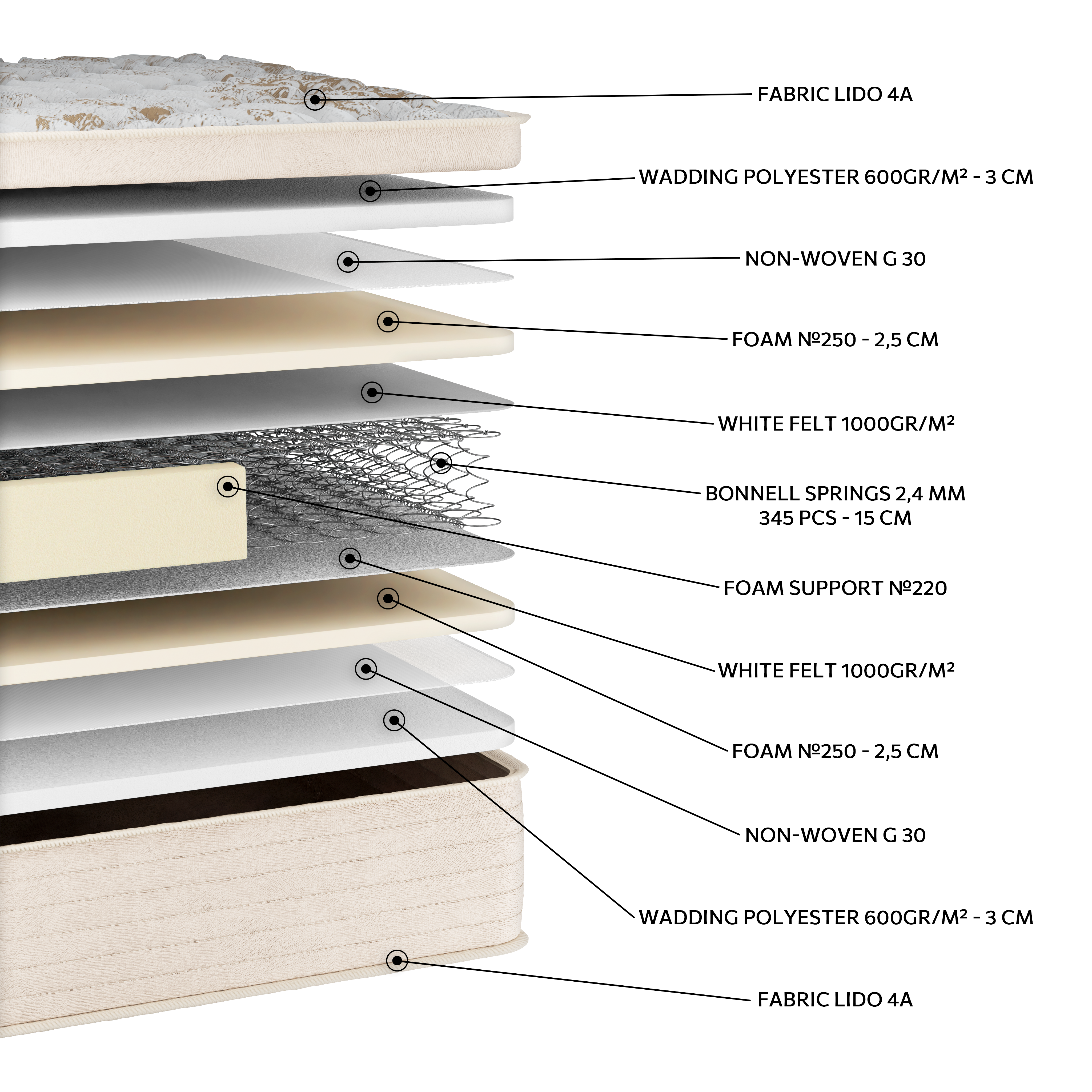 Σκληρό στρώμα με ελατήρια Bonnell, σχεδιασμένο για ανθεκτικότητα και ομοιόμορφη κατανομή βάρους. Οι πολλαπλές στρώσεις αφρού υψηλής πυκνότητας προσφέρουν αυξημένη σταθερότητα, εξασφαλίζοντας σωστή υποστήριξη της σπονδυλικής στήλης. Το ύφασμα Lido 4A παρέχει απαλή αίσθηση και βελτιωμένη διαπνοή, συμβάλλοντας σε ένα πιο δροσερό και υγιεινό περιβάλλον ύπνου. Μια εξαιρετική επιλογή για όσους αναζητούν στιβαρή στήριξη με βελτιωμένη αίσθηση άνεσης.
