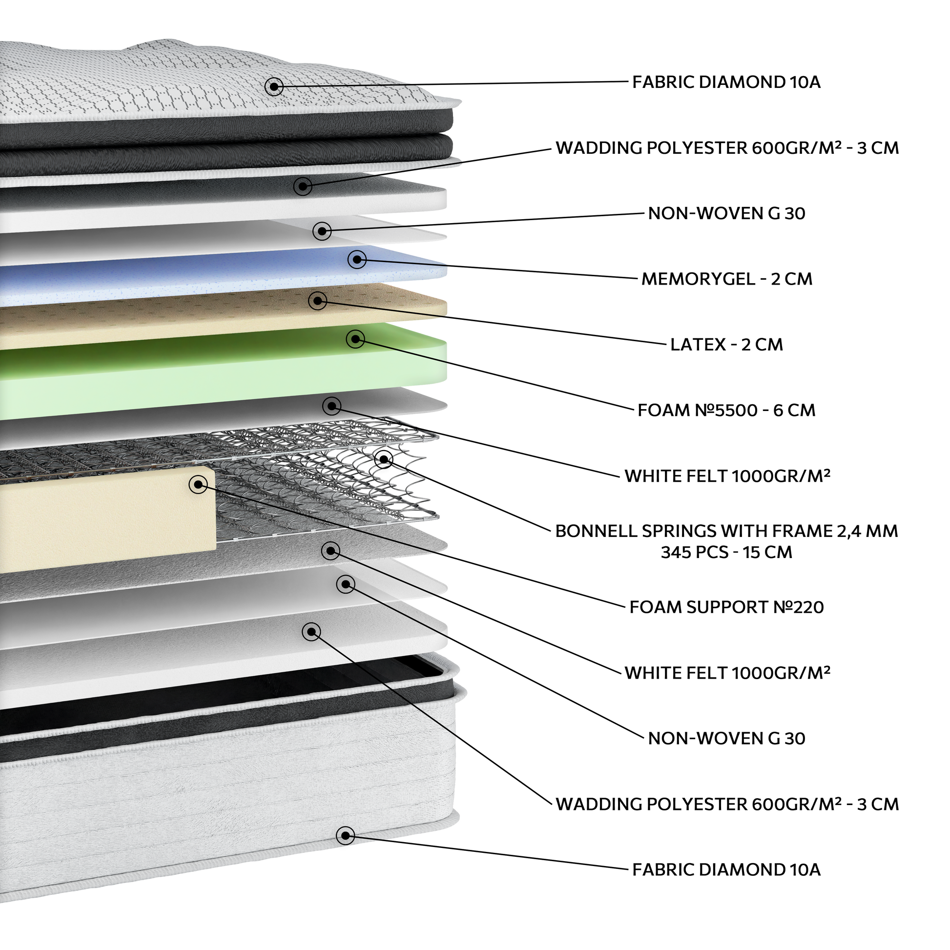 Στρώμα μέτριας σκληρότητας με Pillowtop και ενισχυμένη στήριξη, σχεδιασμένο για άνεση και βέλτιστη υποστήριξη. Τα Bonnell Springs με λαμάκι προσφέρουν αυξημένη αντοχή και σταθερότητα, εξασφαλίζοντας σωστή ευθυγράμμιση της σπονδυλικής στήλης. Οι στρώσεις MemoryGel και Latex προσαρμόζονται στο σώμα, μειώνοντας τα σημεία πίεσης και χαρίζοντας αίσθηση χαλάρωσης. Το Pillowtop προσθέτει μια επιπλέον αίσθηση πολυτέλειας, ενώ το ύφασμα Diamont 10A διατηρεί ιδανικές συνθήκες αερισμού για δροσερό και υγιεινό ύπνο. Μια εξαιρετική επιλογή για όσους θέλουν άνεση και σταθερή στήριξη σε κάθε κίνηση.