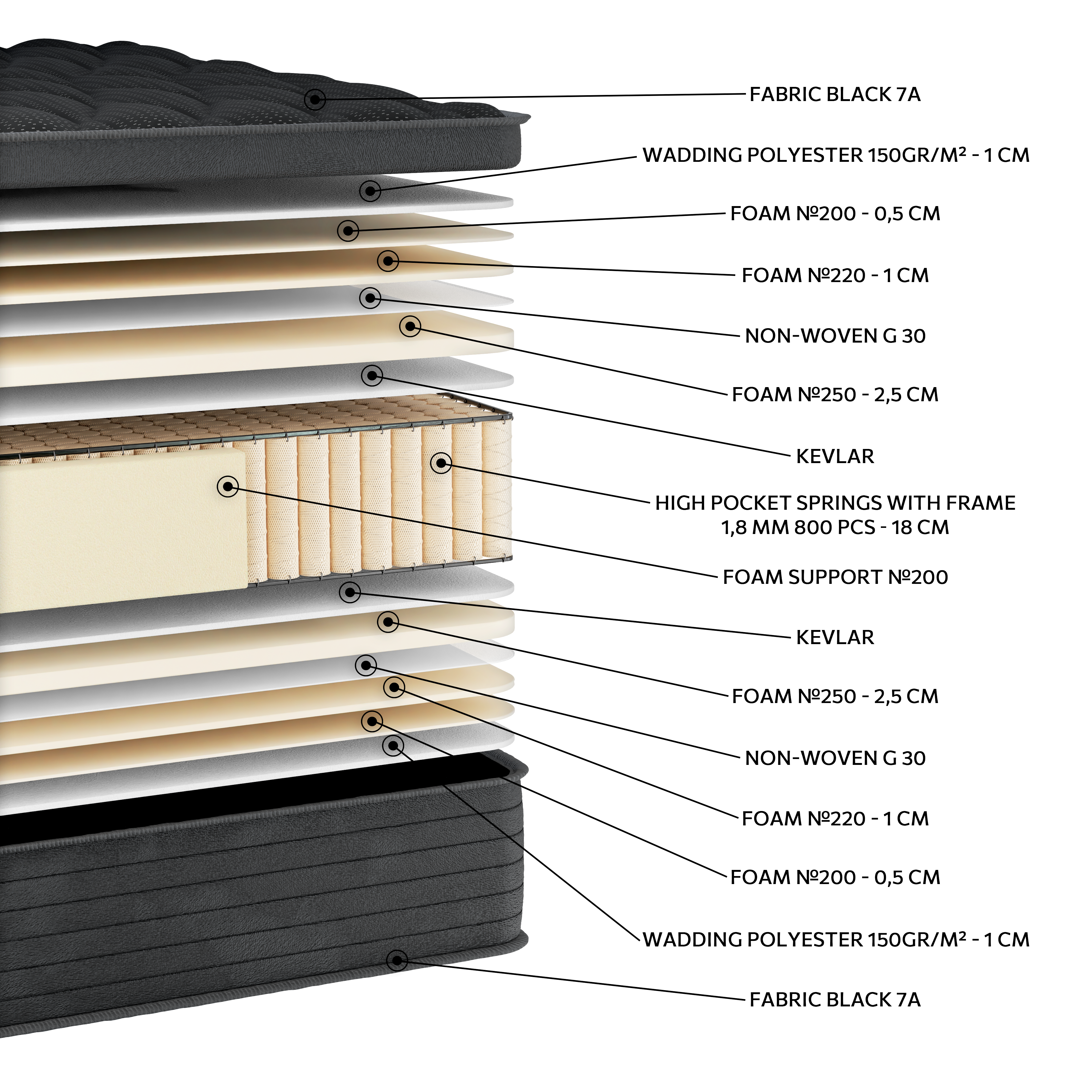 Στρώμα μέτριας προς σκληρής σκληρότητας με υψηλά ελατήρια High Pocket, που προσφέρουν αυξημένη βύθιση και καλύτερη αίσθηση στήριξης. Οι ενισχυμένες στρώσεις αφρού προσφέρουν σταθερότητα και άνεση, ενώ το ύφασμα Black 7A ολοκληρώνει την εμπειρία με μοντέρνα αισθητική και ευχάριστη αίσθηση αφής. Μια εξαιρετική επιλογή για όσους αναζητούν ενισχυμένη στήριξη και σταθερότητα στον ύπνο.