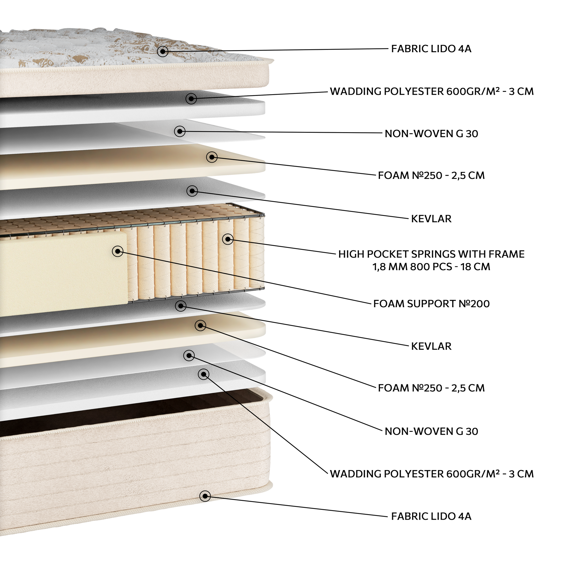 Στρώμα μέτριας προς σκληρής αίσθησης με High Pocket ελατήρια που προσφέρουν μεγαλύτερη βύθιση και ενισχυμένη στήριξη. Οι στρώσεις αφρού υψηλής κατανέμουν ομοιόμορφα το βάρος του σώματος, διασφαλίζοντας σωστή ευθυγράμμιση της σπονδυλικής στήλης. Το ύφασμα Lido 4A προσφέρει απαλή υφή και συμβάλλει στη σωστή κυκλοφορία του αέρα για άνετο και υγιεινό ύπνο. Μια εξαιρετική επιλογή για όσους αναζητούν στήριξη με αίσθηση πολυτέλειας και υψηλή αντοχή στον χρόνο.