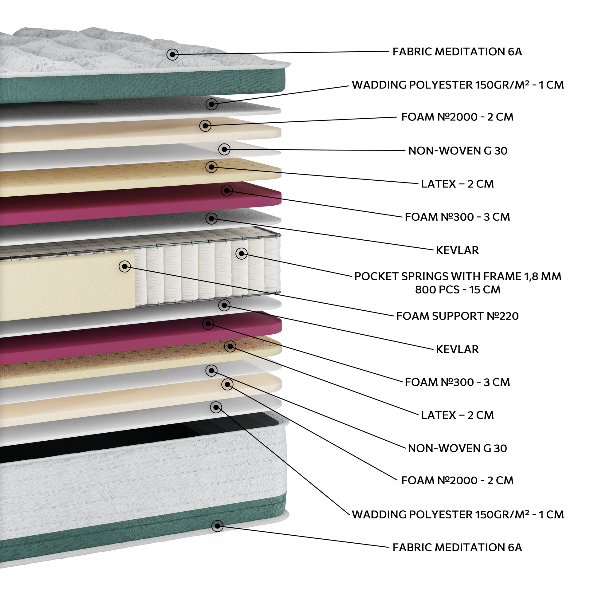 Στρώμα μέτριας σκληρότητας με ανεξάρτητα ελατήρια Pocket, που προσφέρουν προσαρμοσμένη στήριξη και σωστή ευθυγράμμιση του σώματος. Οι στρώσεις από Latex και αφρό υψηλής ποιότητας αγκαλιάζουν το σώμα, μειώνοντας τα σημεία πίεσης και προσφέροντας αίσθηση χαλάρωσης. Το ύφασμα Meditation 6A προσφέρει απαλή υφή και συμβάλλει στη διατήρηση ιδανικής θερμοκρασίας ύπνου.Μια εξαιρετική επιλογή για όσους αναζητούν ισορροπία ανάμεσα στη στήριξη και την άνεση, με φυσική ελαστικότητα και αίσθηση δροσιάς.